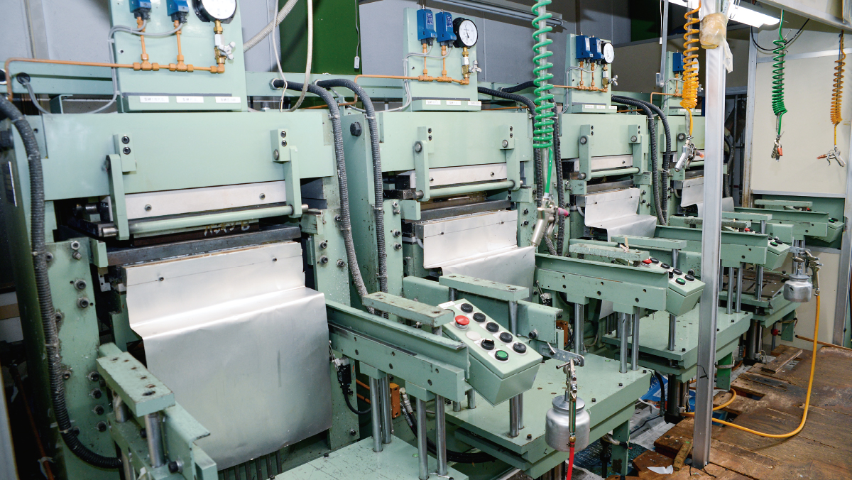 シート状になったシリコンゴム材料を、使用する金型の大きさや構造に合わせて裁断します。